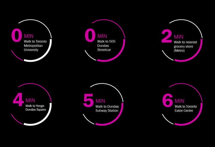 Situated in Toronto’s Garden District, this downtown neighbourhood offers an abundance of lifestyle amenities and daily necessities. With a near-perfect Walk Score, residents are steps away from a variety of dining, shopping, and entertainment venues. Notable attractions like Yonge-Dundas Square and CF Eaton Centre, which houses 235 stores and services, are just minutes away, providing endless opportunities for excitement and convenience.